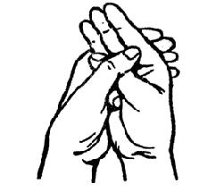 Методика исполнения: мизинец правой руки отгибаем таким образом, чтобы он прикасался к основанию большого пальца, которым слегка прижимаем мизинец. Левой рукой обхватываем правую снизу, при этом большой палец левой руки располагается на большом пальце правой руки.
