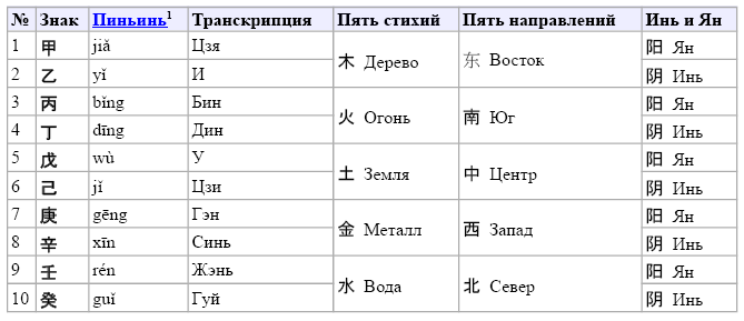 Расположены в следующем порядке: ???????????????????. Используются в сочетании со знаками двенадцатеричного цикла. Происхождение системы до конца не выяснено. Чаще всего совместное использование двух циклов исчисления объясняется как символ взаимодействия Инь и Ян, Неба и Земли. Другим сравнением подобного рода регулярно выступает переплетение вертикальных и горизонтальных нитей в ткани.