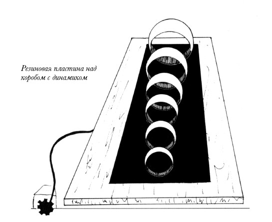 К резиновой пластине, которая находится над динамиком, прикреплено несколько металлических колец разного диаметра, от 5 до 15 сантиметров (рис. 6.5). Посетитель может регулировать звук, который издает динамик, вращая рукоятку, и таким образом менять частоту, с которой вибрирует резиновая пластина.