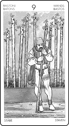 Одинокая фигура на Девятке Жезлов – раненый воин; он стоит спиной к стене. Закаленный в боях воин подозрителен и напряжен. Он решителен, мудр и смел, вместе с тем осторожен и, кажется, нашел место, где может укрыться, чтобы собраться с мыслями и силами и подготовиться к неизбежному грядущему неизвестному.