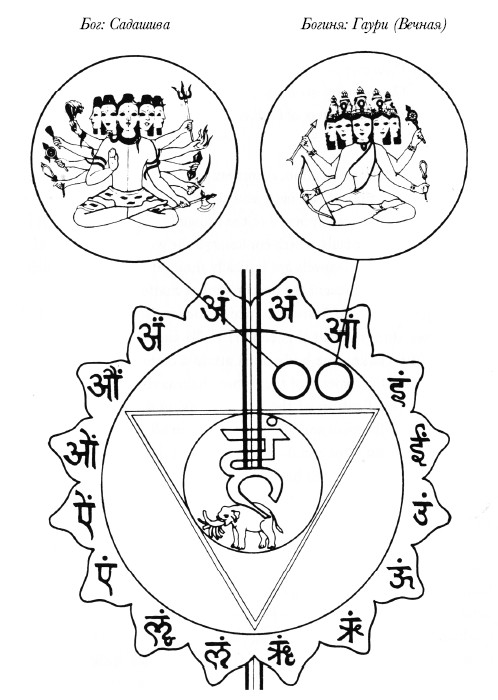 Внутри чакры мы снова видим Айравату, белого слона с множеством бивней. Он находится в круге, заключенном в треугольник, который указывает вниз, и это символизирует воплощение речи. Божества в чакре – это бог Садашива (версия Шивы, также известная как Панкана, пятеричный) и богиня Гаури (эпитет, означающий «справедливая», «желтая» или «сверкающая»), Гаури – также название для целого класса богинь, в который входят Ума, Парвати, Рамбха, Тотала и Трипура. Каждое божество в этой чакре изображено с пятью лицами (рис. 6.1)