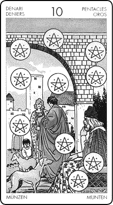 Традиционно Десятка Пентаклей известна как карта богатства. В астрологии она ассоциируется с третьим десятком градусов Девы, где Меркурий, посланник богов, прилежно руководит линиями связи.