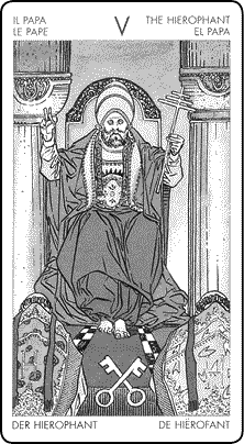 Со своего папского престола Иерофант, подняв правую руку, благословляет двух коленопреклоненных помощников. В его левой руке тройной, как и митра на голове, золотой крест. Эти три деления представляют собой Святую Троицу – Отца, Сына и Святого Духа.